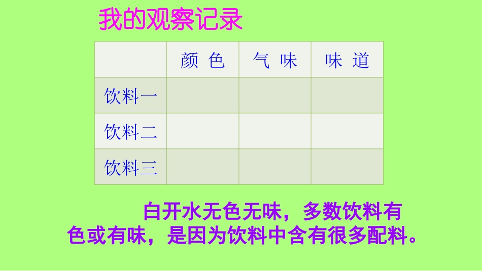 知识链接:饮料是指白开水以外的、以水为基本原料,采用不同的配方和制造方法生产出来,供人们直接饮用的液体食品。我的观察记录颜色气味味道饮料一饮料二饮料三白开水无色无味,多数饮料有色或有味,是因为饮料...