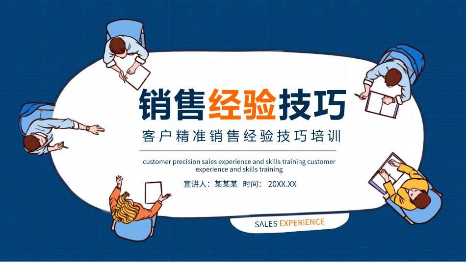 销售经验技巧客户精准销售经验技巧培训customerprecisionsalesexperienceandskillstrainingcustomerexperienceandskillstraining宣讲人:某某某时间:20XX.XXSALESEXPERIENCE目录03040201销售怎样开场常用提问对...