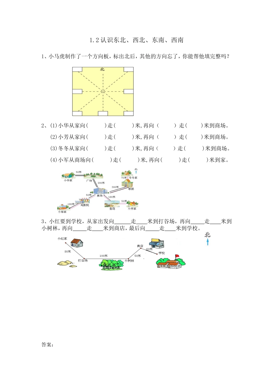 1.2认识东北、西北、东南、西南1、小马虎制作了一个方向板,标出北后,其他的方向忘了,你能帮他填完整吗?2、(1)小华从家向()走()米,再向()走()米到商场。(2)小芳从家向()走()米,再向()走()米到商场。(3)冬...