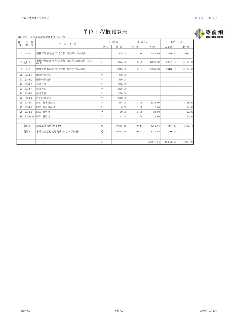 广联达慧中造价管理系统第1页共4页编制人:审核人:2008年10月29日单位工程概预算表项目文件:北京某高层住宅楼采暖工程预算子目名称工程量价值(元)其中(元)单位数量单价合价人工费材料费11-1m673.0012.37832...
