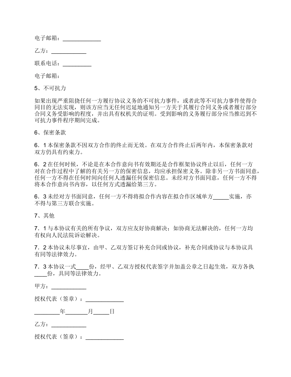 2022-众创空间合作协议范本甲方:___________通信地址:_________乙方:___________通信地址:_________为了更好的发挥甲、乙双方的优势,合作共赢,双方达成战略合作框架协议(以下简称“本协议”)如下:1、合...