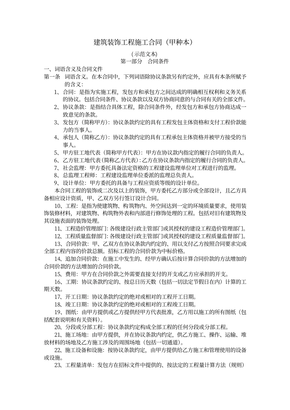 建筑装饰工程施工合同(甲种本)(示范文本)第一部分合同条件一、词语含义及合同文件第一条词语含义。在本合同中,下列词语除协议条款另有约定外,应具有本条所赋予的含义:1、合同:是指为实施工程,发包方和承包...