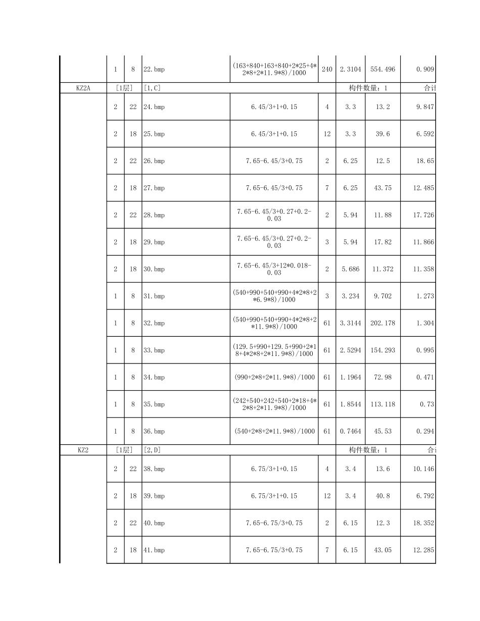 构件钢筋明细表厂房算量构件名称级别直径钢筋简图计算式根数长度总长KZ1[0.3/1,-0.4/D]2256.bmp6.75/3+1+0.15203.46813.1012257.bmp7.65-6.75/3+0.6663623.122258.bmp7.65-6.75/3+0.6-0.9+0.966363.8532259.bmp85...