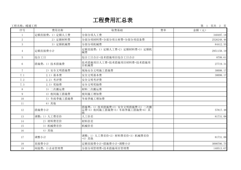 工程费用汇总表工程名称:暖通工程序号费用名称取费基础费率金额(元)1分部分项人工费340497.1822526248.463分部分项机械费84412.554定额直接费小计2951158.195综合工日8799.61627719.317现场安全文明施工措施费...