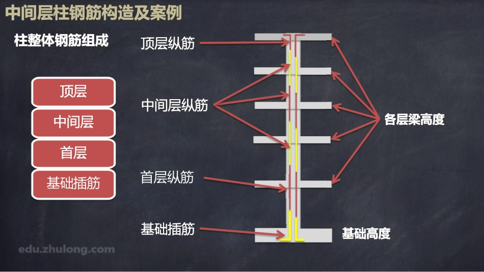 第七节中间层柱钢筋构造及案例丹姗目录一、中间层柱钢筋构造二、中间层柱钢筋计算案例中间层柱钢筋构造及案例中间层纵筋基础插筋顶层纵筋顶层中间层首层柱整体钢筋组成基础高度各层梁高度基础插筋首层纵筋中间层...
