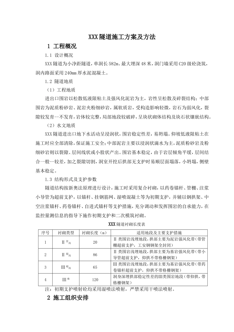 XXX隧道施工方案及方法1工程概况1.1设计概况XXX隧道为小净距隧道,单洞长582m。最大埋深48米,洞门墙采用C20级砼浇筑,洞内路面采用240mm厚水泥混凝土。1.2隧道地质(1)工程地质进出口围岩以松散低液限粘土及强...