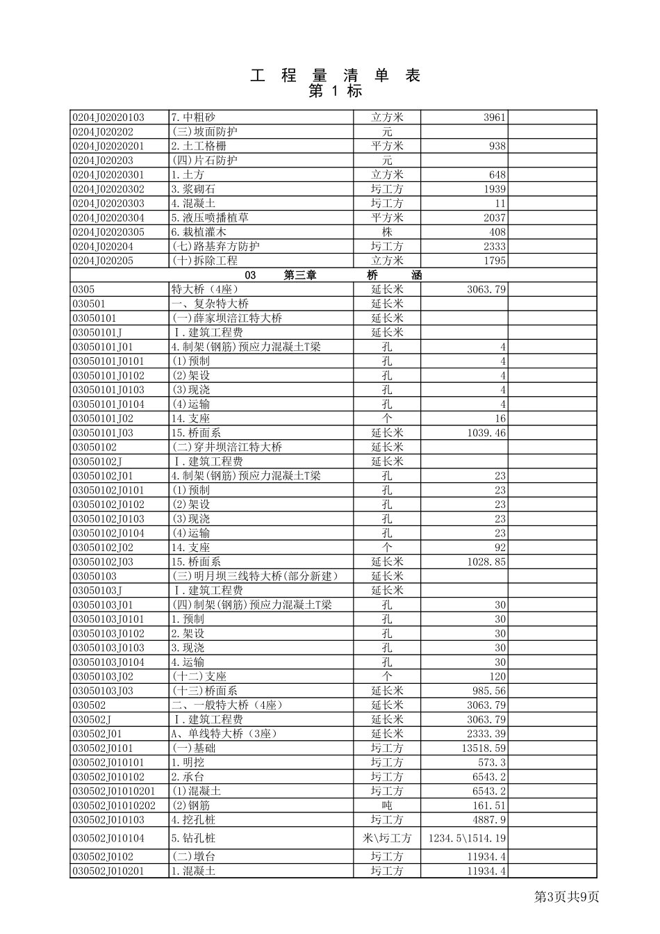 工程量清单表第1标第1页共9页编码名称计量单位工程数量附注0101拆迁及征地费用正线公里37.690101J正线公里37.690101J01一、改移道路公里2.830101J0101立方米480310101J0102圬工方12950101J0103平方米105640101J01...