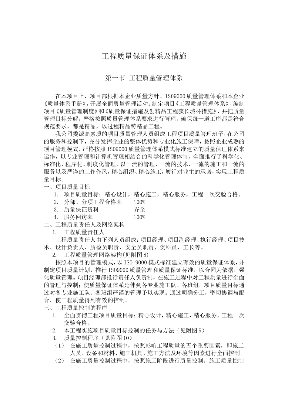 工程质量保证体系及措施第一节工程质量管理体系在本项目上,项目部根据本企业质量方针、IS09000质量管理体系和本企业《质量体系手册》,开展全面质量管理活动;制定项目《工程质量管理体系》、编制项目《质量管理...