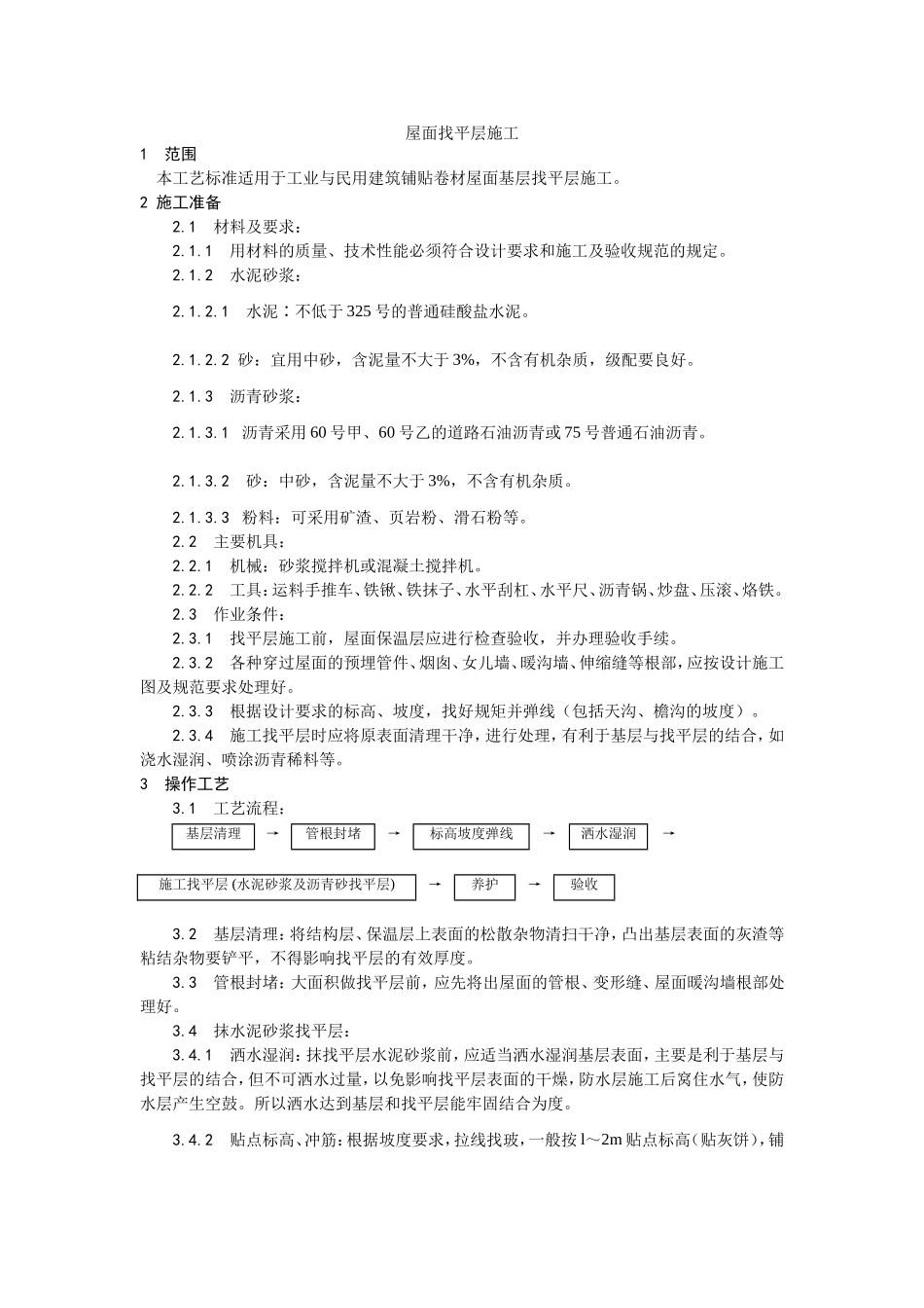 屋面找平层施工1范围本工艺标准适用于工业与民用建筑铺贴卷材屋面基层找平层施工。2施工准备2.1材料及要求:2.1.1用材料的质量、技术性能必须符合设计要求和施工及验收规范的规定。2.1.2水泥砂浆:2.1.2.1水泥∶...