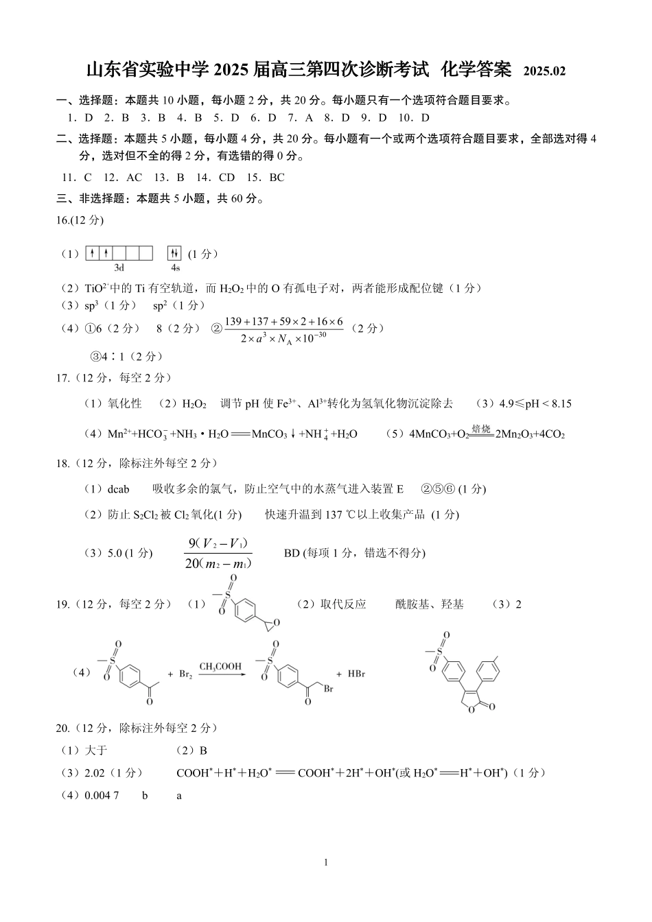 2025届山东省实验中学高三下学期第四次诊断考试化学答案.pdf_第1页