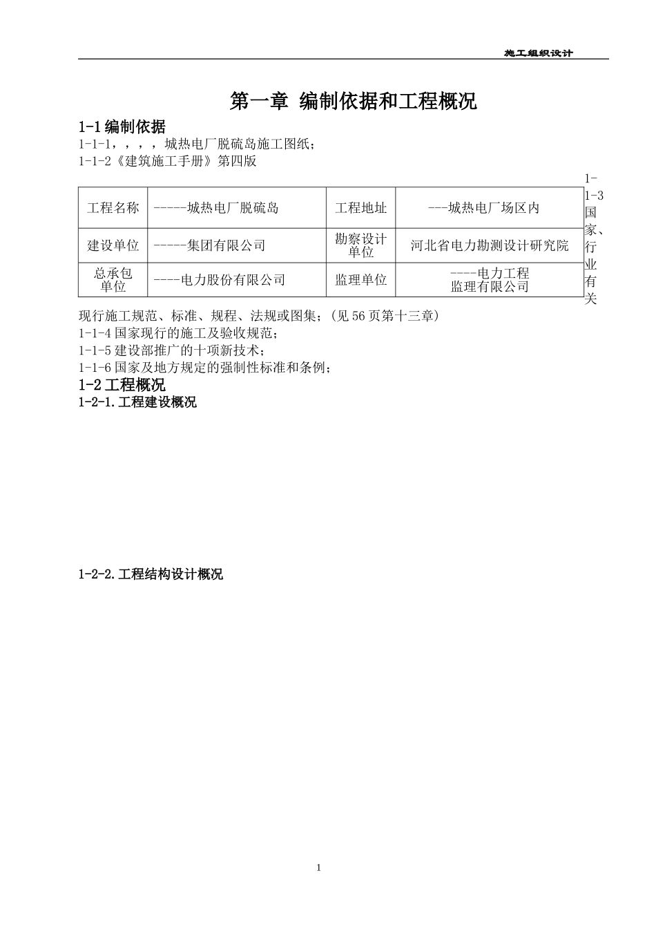 施工组织设计第一章编制依据和工程概况1-1编制依据1-1-1,,,,城热电厂脱硫岛施工图纸;1-1-2《建筑施工手册》第四版1-1-3国家、行业有关现行施工规范、标准、规程、法规或图集;(见56页第十三章)1-1-4国家现行...