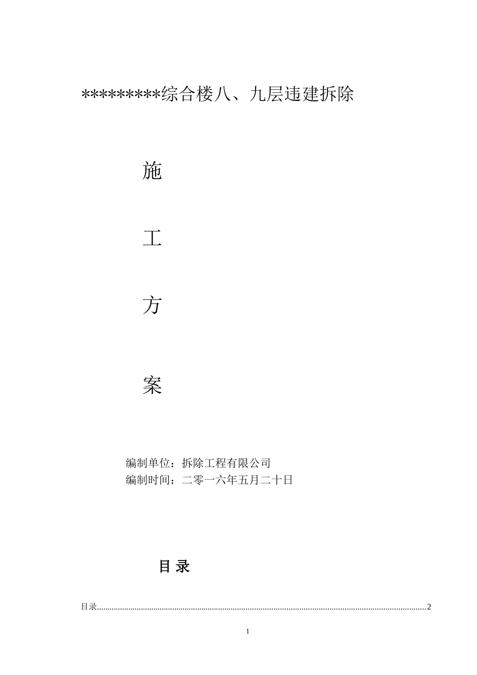 *********综合楼八、九层违建拆除施工方案编制单位:拆除工程有限公司编制时间:二零一六年五月二十日目录目录.................................................................................................