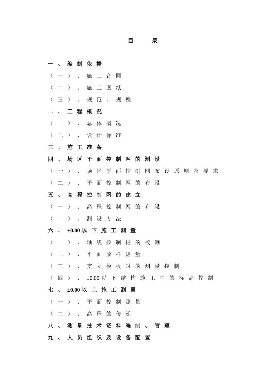 工程测量(结构)施工方案XX工程项目经理部年月目录一、编制依据(一)、施工合同(二)、施工图纸(三)、规范、规程二、工程概况(一)、总体概况(二)、设计标准三、施工准备四、场区平面控制网的测设(一)...