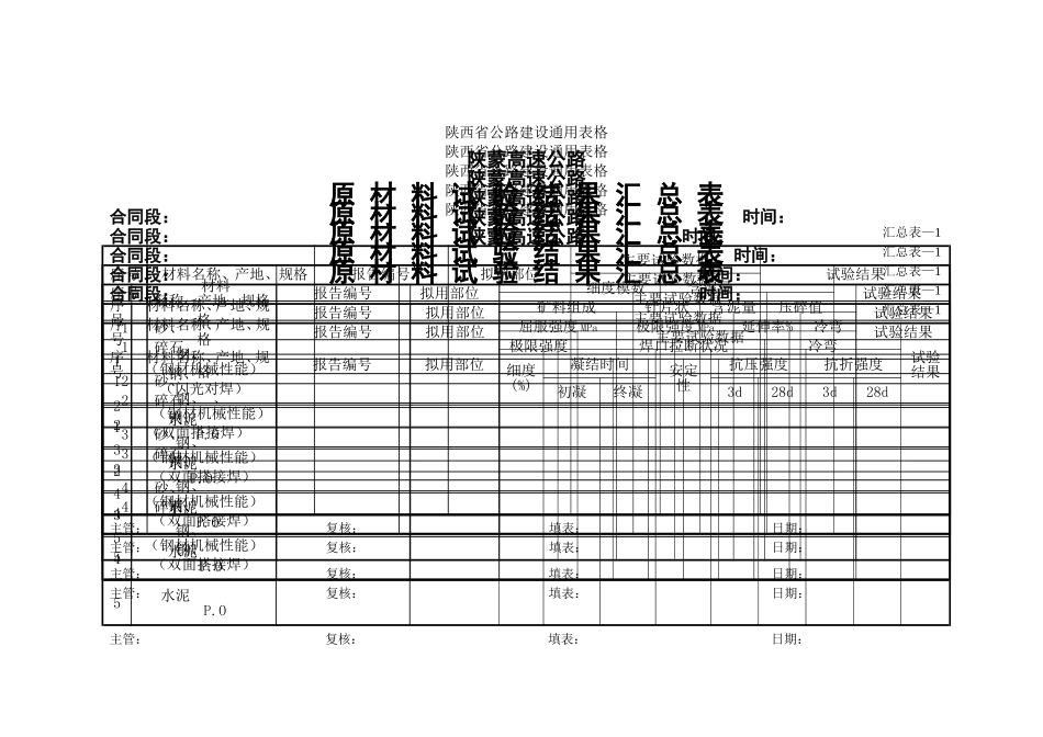 陕西省公路建设通用表格陕蒙高速公路原材料试验结果汇总表合同段:时间:汇总表—1序号材料名称、产地、规格报告编号拟用部位主要试验数据试验结果细度模数含泥量1砂、2砂、3砂、4砂、主管:复核:填表:日期:陕...