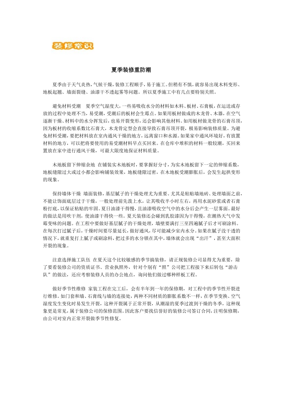 夏季装修重防潮夏季由于天气炎热,气候干燥,装修工程顺手,易于施工。但稍有不慎,就容易出现木料变形、地板起翘、墙面裂缝、油漆干不透起雾等问题。所以夏季施工中有几点要特别关照。避免材料受潮夏季空气湿度...