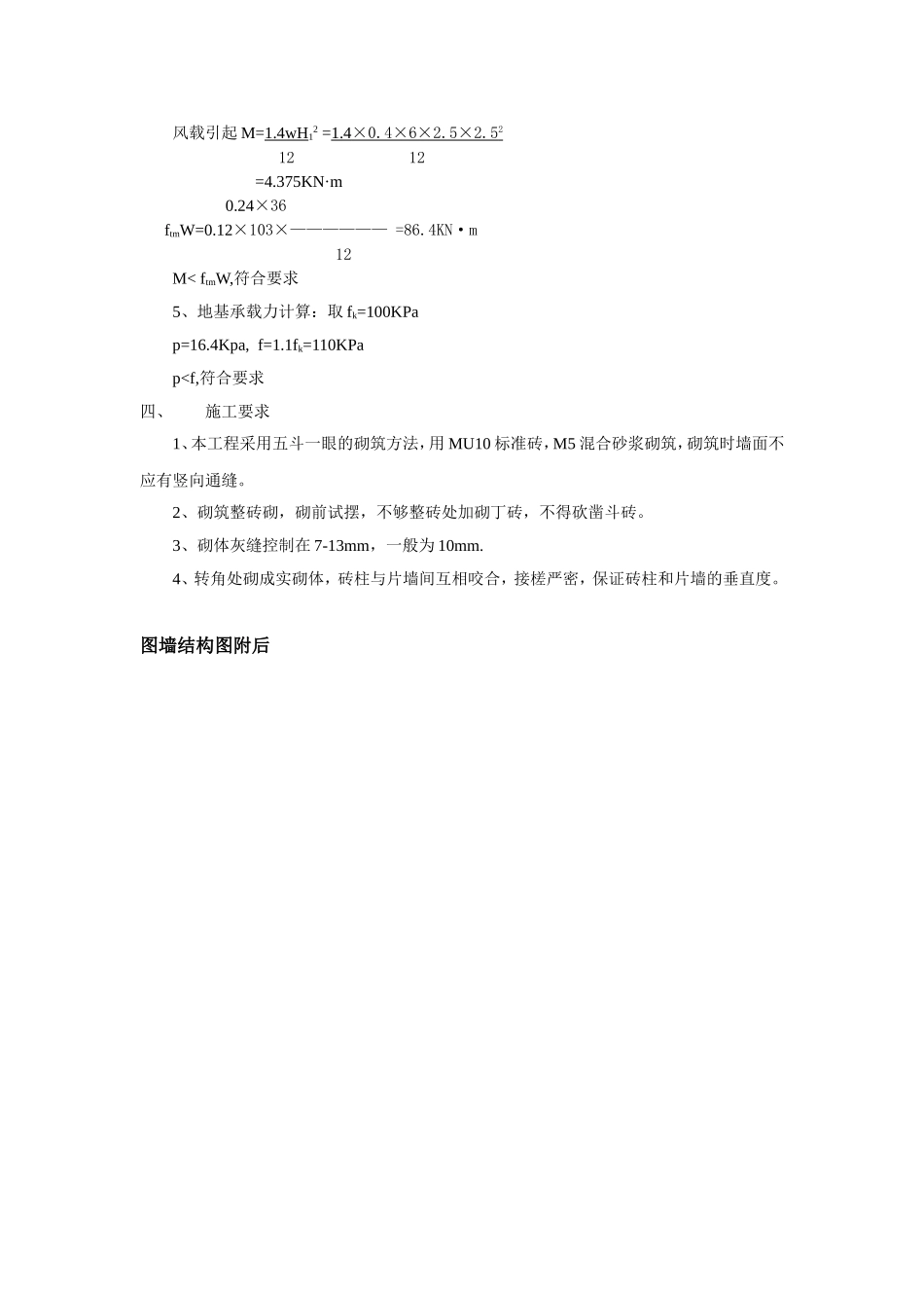 围墙结构计算根据《砖砌体结构设计规范》计算一、简述本工地四周均设240厚空斗砖砌体,高为2.50m,每隔6m设一砖柱240×360,砌体采用MU10九五砖,M5水泥石灰砂浆砌筑,砌筑方式为五斗一眠。基础采用刚性基础(砌专...