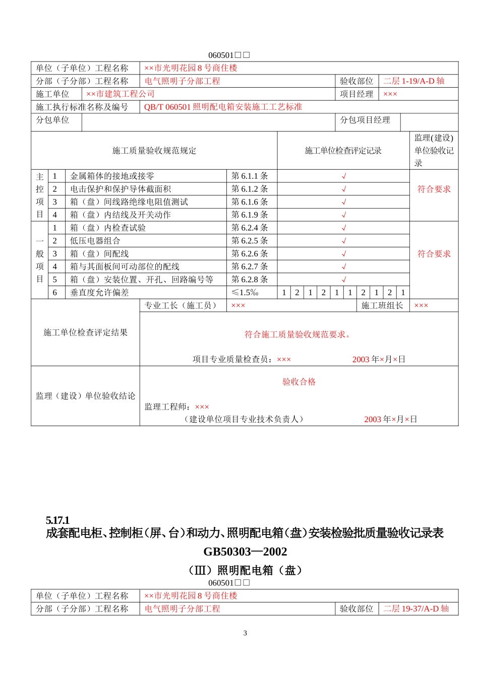 5.17.1成套配电柜、控制柜(屏、台)和动力、照明配电箱(盘)安装检验批质量验收记录表GB50303—2002(Ⅲ)照明配电箱(盘)060501□□单位(子单位)工程名称××市光明花园8号商住楼分部(子分部)工程名称电...