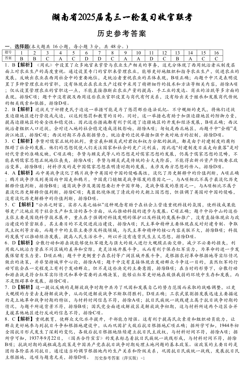 2025届湖南省高三下学期一轮复习收官联考历史参考答案.pdf_第1页