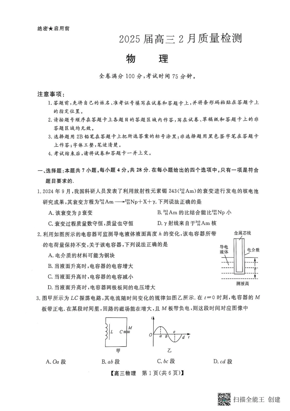 河南省部分学校2024-2025学年高三下学期2月质量检测物理试题.pdf