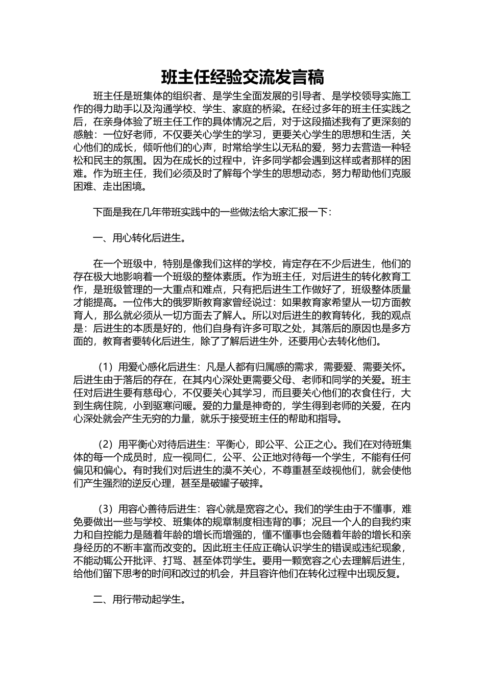 班主任经验交流发言稿班主任是班集体的组织者、是学生全面发展的引导者、是学校领导实施工作的得力助手以及沟通学校、学生、家庭的桥梁。在经过多年的班主任实践之后,在亲身体验了班主任工作的具体情况之后,对...