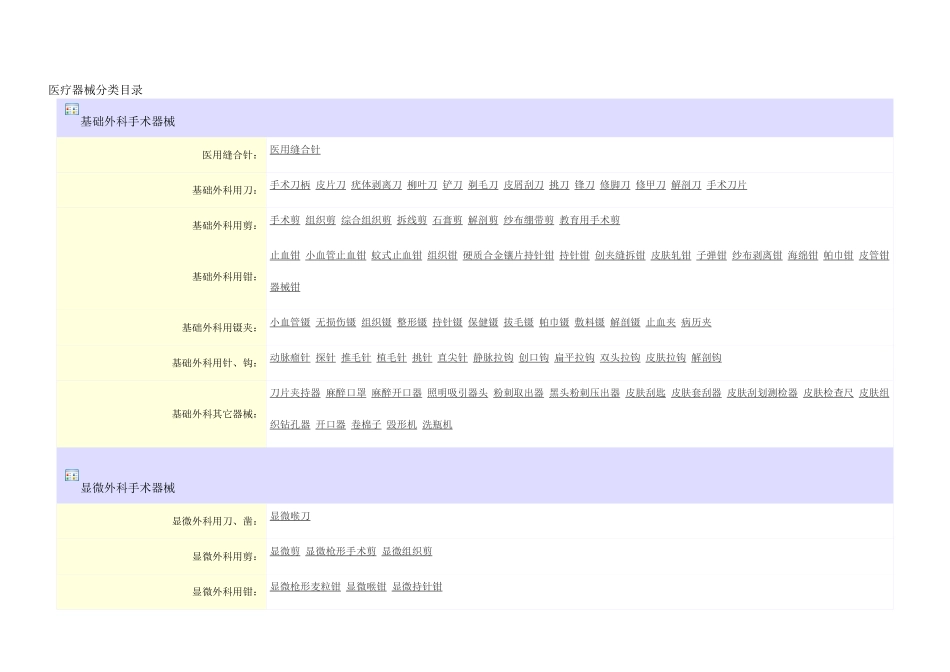 医疗器械分类目录基础外科手术器械医用缝合针:医用缝合针基础外科用刀:手术刀柄皮片刀疣体剥离刀柳叶刀铲刀剃毛刀皮屑刮刀挑刀锋刀修脚刀修甲刀解剖刀手术刀片基础外科用剪:手术剪组织剪综合组织剪拆线剪石膏...
