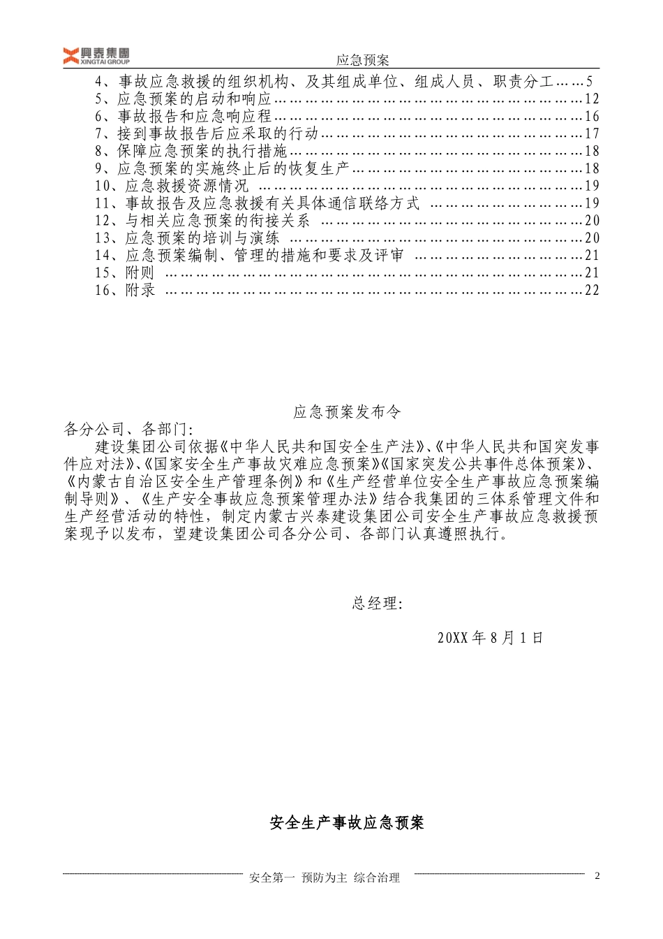 编号:XT/YJYA/A-20XX版本号:A/0安全生产事故应急救援总预案编制:应急预案编辑委员会审核:王浩审批:韩平内蒙古兴泰建设集团公司20XX年8月1日实施目录0.1、应急预案发布令……………………………………………...