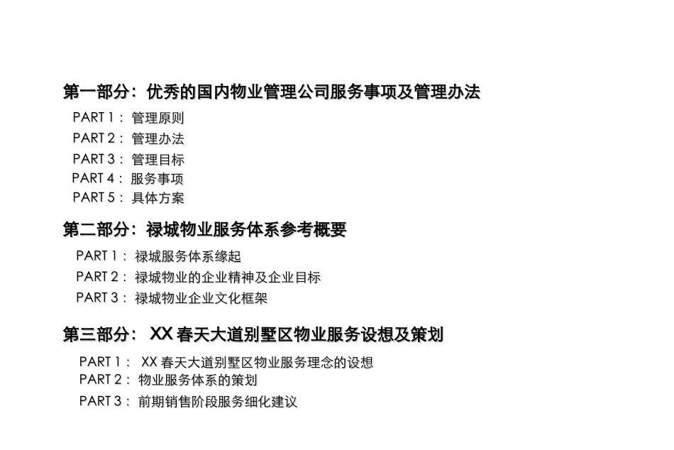 高端别墅区物业服务方案第一部分:优秀的国内物业管理公司服务事项及管理办法第一部分:优秀的国内物业管理公司服务事项及管理办法PART1PART1:管理原则:管理原则PART2PART2:管理办法:管理办法PART3PART3:管...