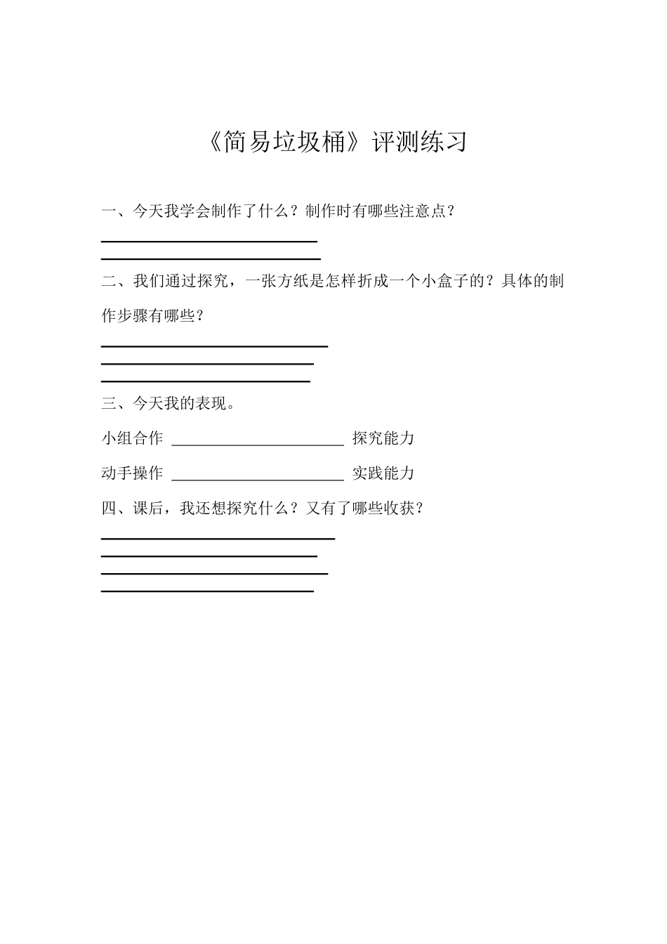 《简易垃圾桶》评测练习一、今天我学会制作了什么?制作时有哪些注意点?二、我们通过探究,一张方纸是怎样折成一个小盒子的?具体的制作步骤有哪些?三、今天我的表现。小组合作探究能力动手操作实践能力四、课...