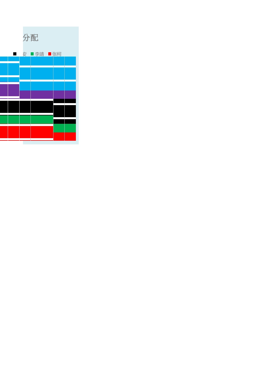 姓名比例累积求和张柯18%18%182222222211李靖10%28%281111111111王安22%50%502222222233黄国明15%65%652222211111谢斌35%100%1003333344444总计100%百分比分配谢斌黄国明王安李靖张柯百分比分配谢斌黄国明王安李靖张柯