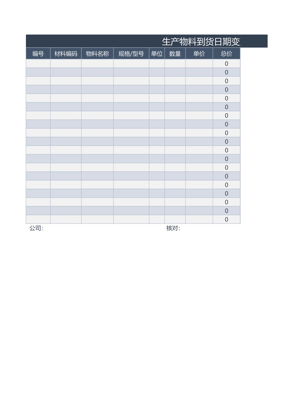 生产物料到货日期变更表编号材料编码物料名称单位数量单价总价0000000000000000000公司:核对:规格/型号生产物料到货日期变更表供货商原定到货日期现到货日期(变更)备注日期: