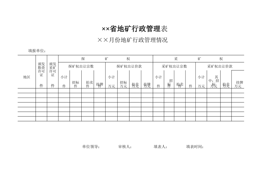 填报单位:探矿权出让价款采矿权出让宗数采矿权出让价款地区小计小计小计小计件件件件件件万元万元万元万元件件件件万元万元万元万元单位领导:审核人:填表人:填表时间:××省地矿行政管理表××月份地矿行政...