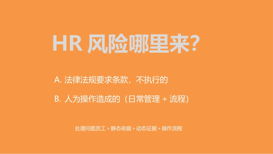 员工关系风险管理HR风险哪里来?A.法律法规要求条款,不执行的B.人为操作造成的(日常管理+流程)处理问题员工=静态依据+动态证据+操作流程入职离职风险管理入职应聘/报到劳动合同信息确认试用期一、应聘...