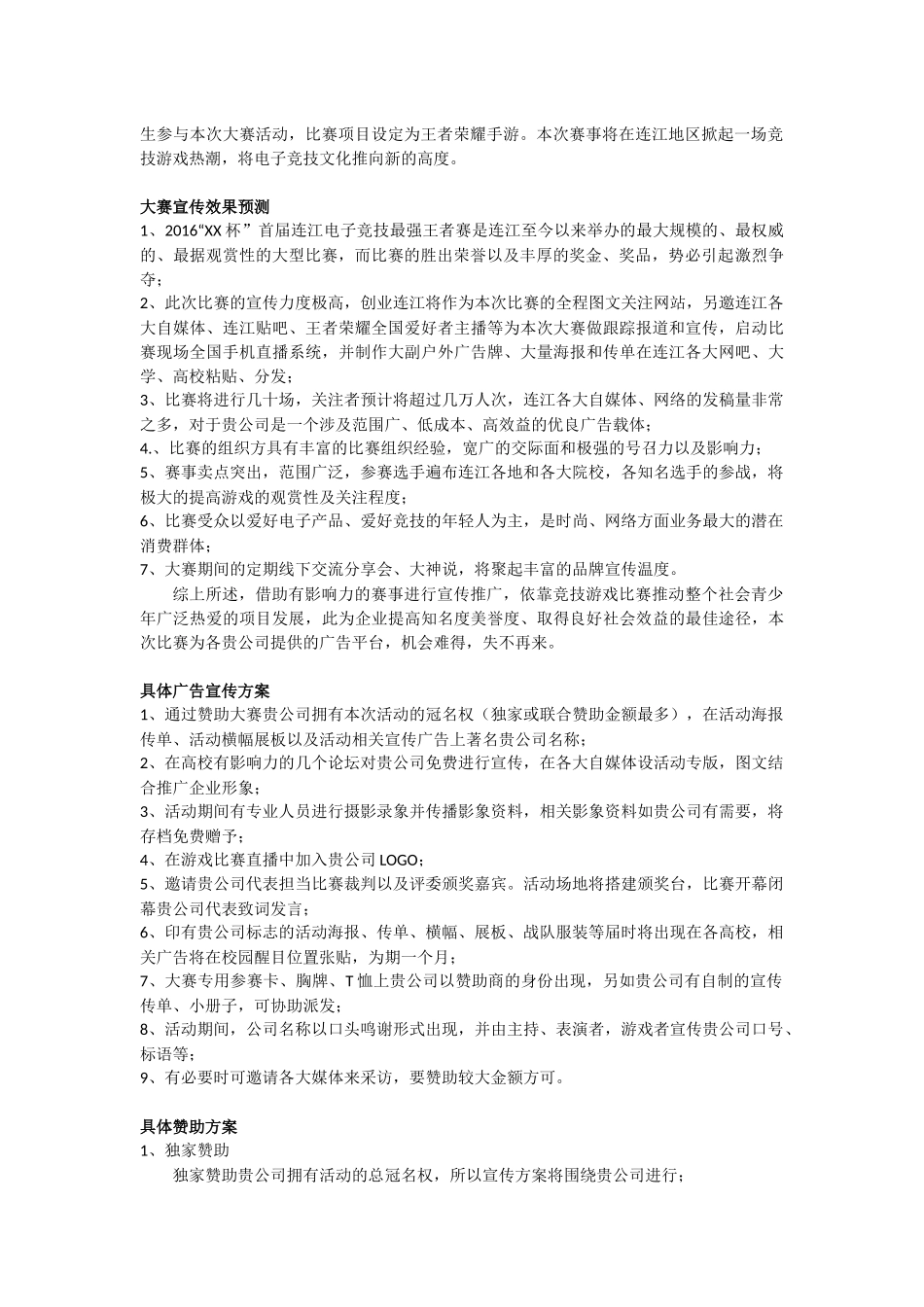 王者荣耀XX·首届(XXXX杯)手游竞技商业计划书背景时至今日,电子竞技已在全球蓬勃发展,持续十余年热度依然不减。2003年11月,国家体育总局已承认电子竞技为我国正式开展的第99个体育竞技项目。2013年3月,国家...