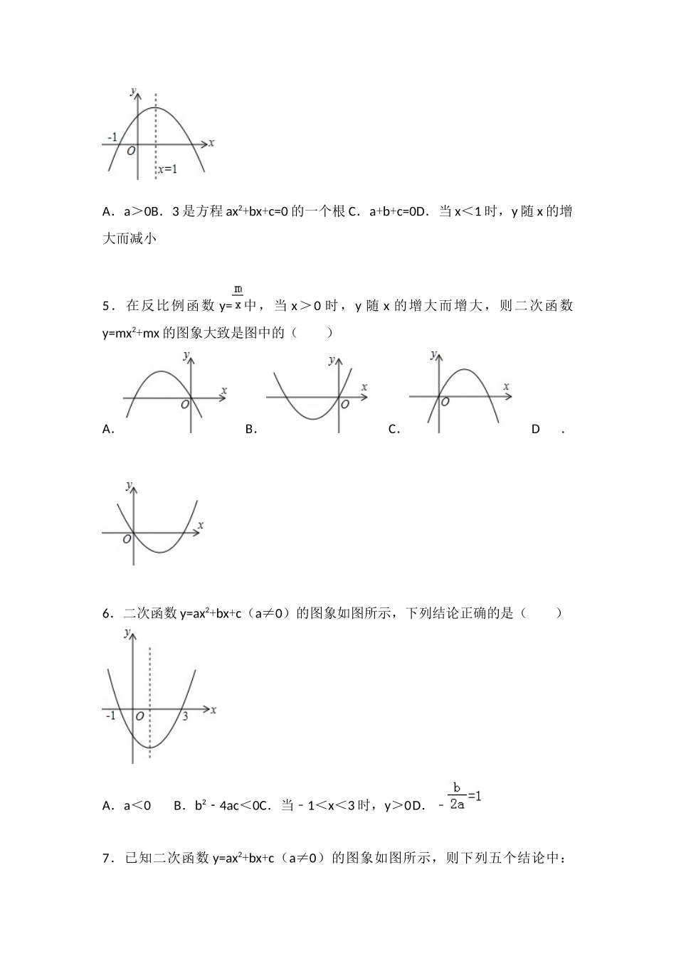 第22章二次函数测试卷(1)一、选择题1.二次函数y=ax2+bx+c(a≠0)的图象如图所示,则下列结论中正确的是()A.a>0B.当﹣1<x<3时,y>0C.c<0D.当x≥1时,y随x的增大而增大2.二次函数y=ax2+bx+c的图象如...