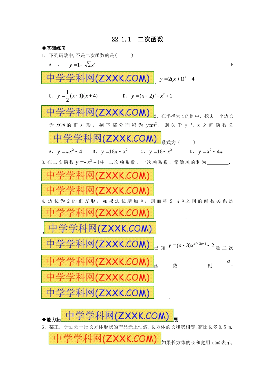22.1.1二次函数◆基础练习1.下列函数中,不是二次函数的是()A、212yxB、22(1)4yxC、1(1)(4)2yxxD、22(2)1yxx2.在半径为4的圆中,挖去一个边长为xcm的正方形,剩下部分面积为2ycm,则关于...