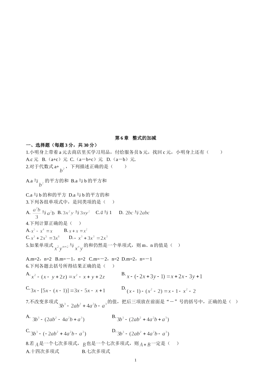 1第6章整式的加减一、选择题(每题3分,共30分)1.小明身上带着a元去商店里买学习用品,付给服务员b元,找回c元,小明身上还有()A.c元B.(a+c)元C.(a-b+c)元D.(a-b)元.2.对于代数式a+,下列描述正确的是...