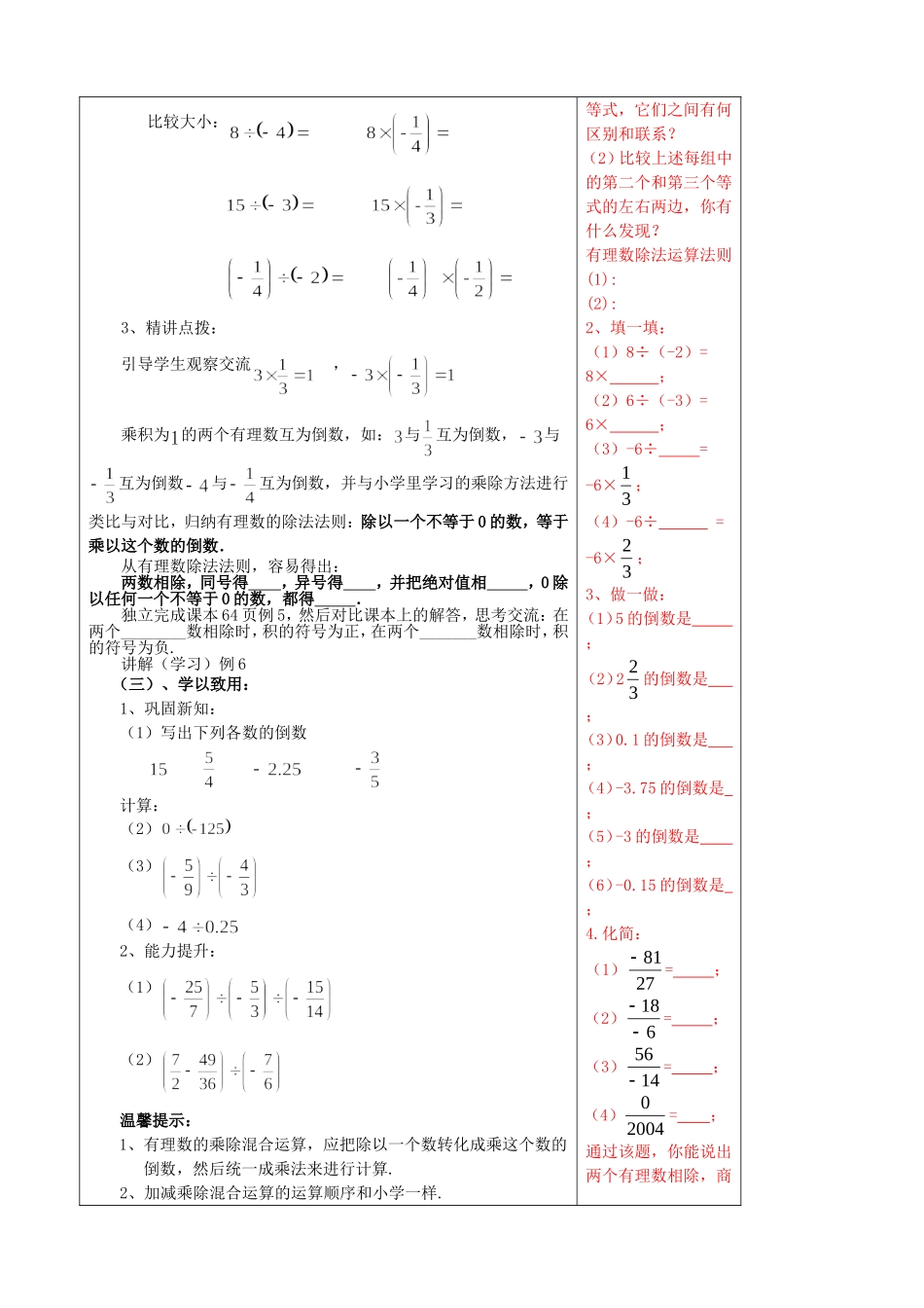 3.2有理数的乘法与除法(第3课时)教学案一、教与学目标:1、让学生能说出有理数除法的法则,会进行有理数除法的运算.2、掌握求有理数倒数的方法,并能熟练地求出一个给定的有理数的倒数.3、能熟练地进行简单的有...