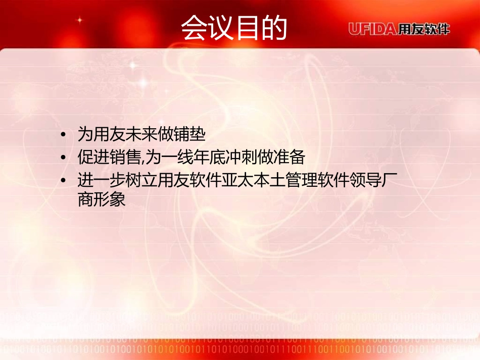 2010年用友软件用户年会会议目的•为用友未来做铺垫•促进销售,为一线年底冲刺做准备•进一步树立用友软件亚太本土管理软件领导厂商形象我们对会议的理解这不是一次普通的年会这是用友开启全新策略的新篇章的重要...
