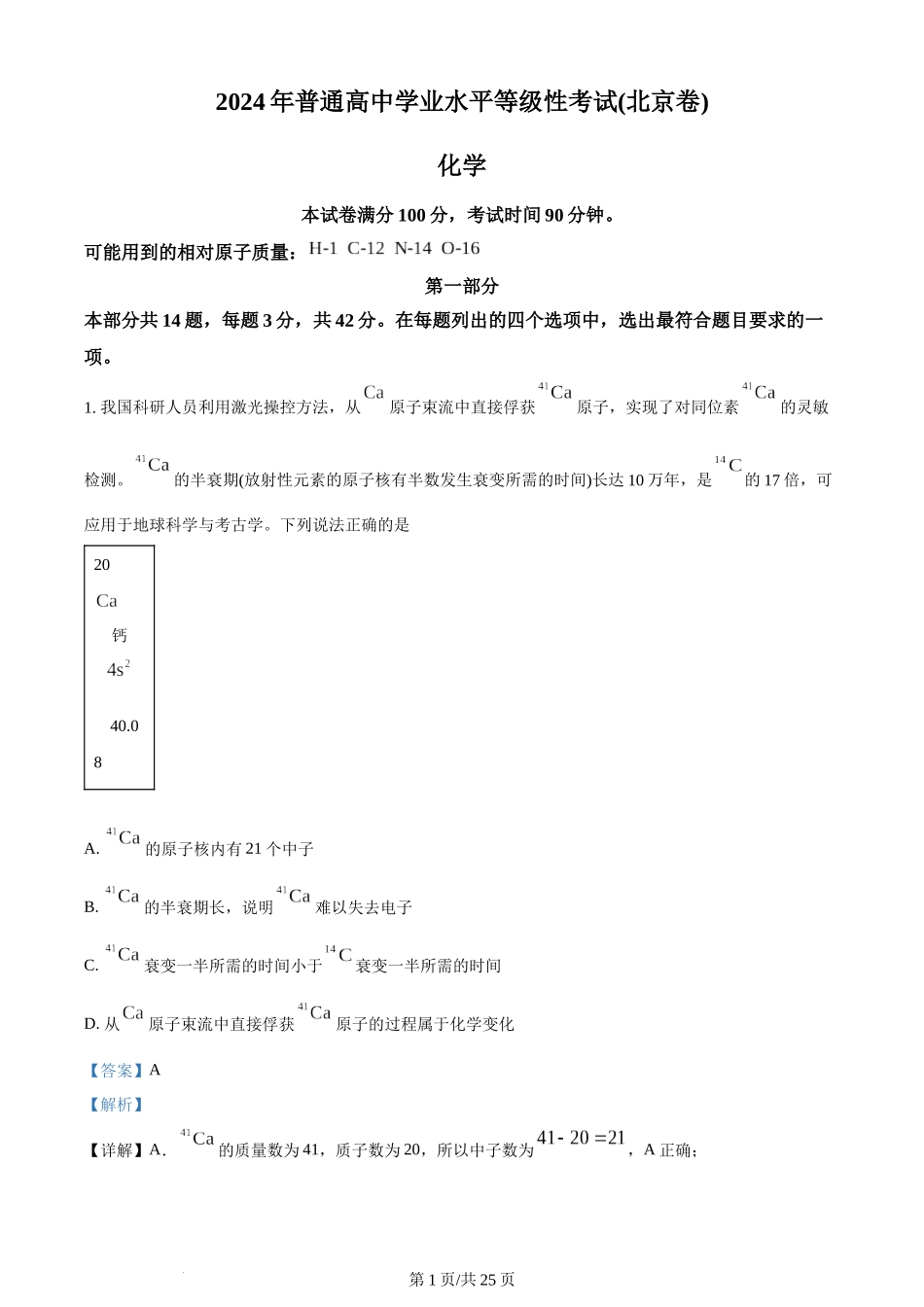 2024年普通高中学业水平等级性考试(北京卷)化学本试卷满分100分,考试时间90分钟。可能用到的相对原子质量:第一部分本部分共14题,每题3分,共42分。在每题列出的四个选项中,选出最符合题目要求的一项。1.我国...
