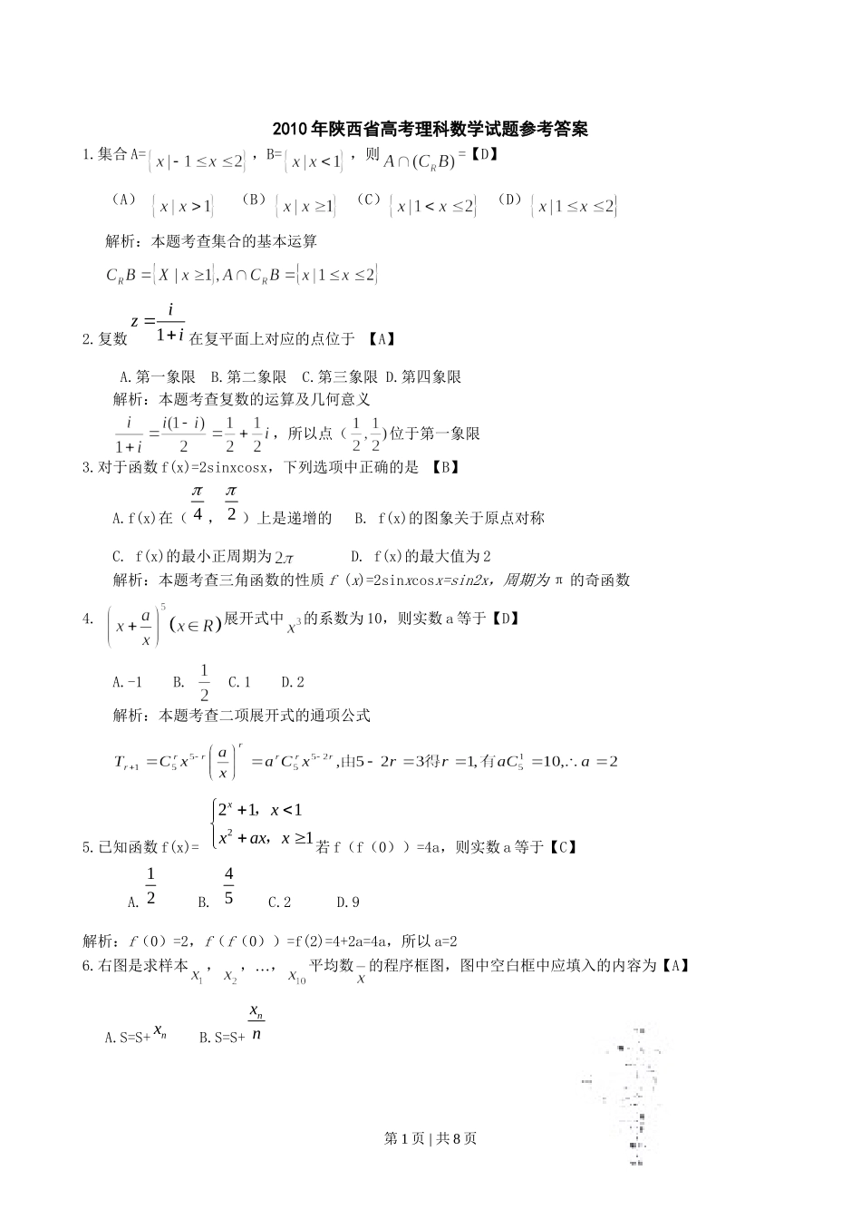 2010年陕西省高考理科数学试题参考答案1.集合A=,B=,则=【D】(A)(B)(C)(D)解析:本题考查集合的基本运算2.复数1izi在复平面上对应的点位于【A】A.第一象限B.第二象限C.第三象限D.第四象限解析:本题...