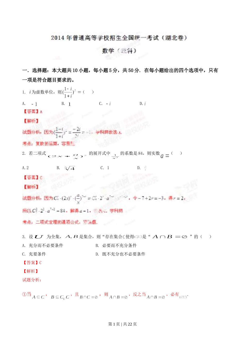 (官方发布)2014年高考数学真题(理)(湖北)(解析卷).doc_第1页
