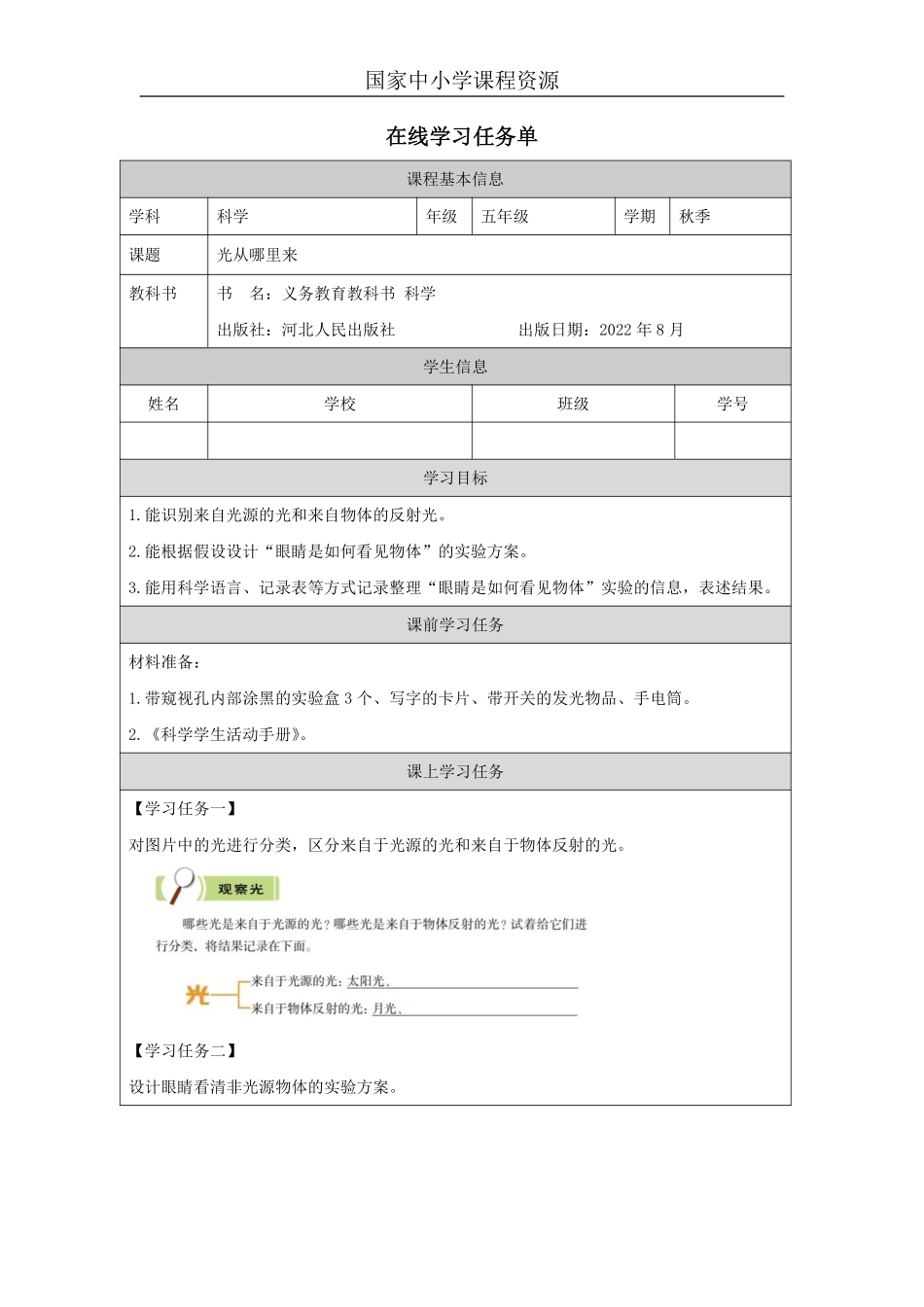 国家中小学课程资源在线学习任务单课程基本信息学科科学年级五年级学期秋季课题光从哪里来教科书书名:义务教育教科书科学出版社:河北人民出版社出版日期:2022年8月学生信息姓名学校班级学号学习目标1.能识别来...