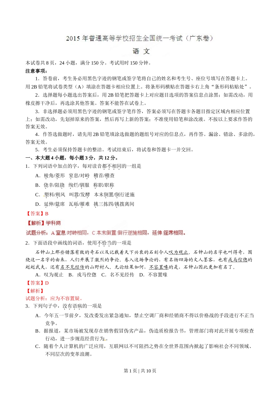 (官方发布)2015年高考语文真题(广东)(解析卷).doc_第1页