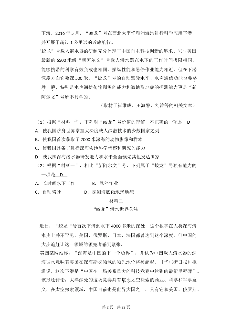 2016年北京市高考语文试卷参考答案与试题解析一、本大题共1小题,共24分.1.(24分)阅读下面材料,完成下列各题。材料一自主科技创新催生“蛟龙”入水二十一世纪以来,世界各国都在大力开展探索海洋、开发海洋...
