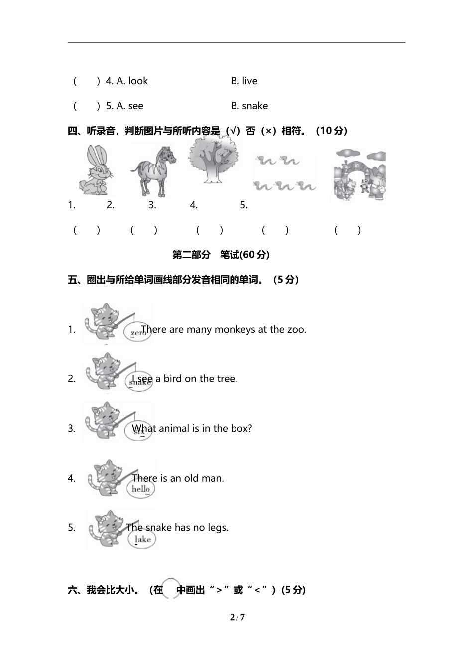 Unit2单元测试卷时间:40分钟满分:100分听力(40分)笔试(60分)总分题号一二三四五六七八九十十一十二得分第一部分听力(40分)一、听录音,给图片排序。(10分)()()()()()二、听录音,圈出相应数量...