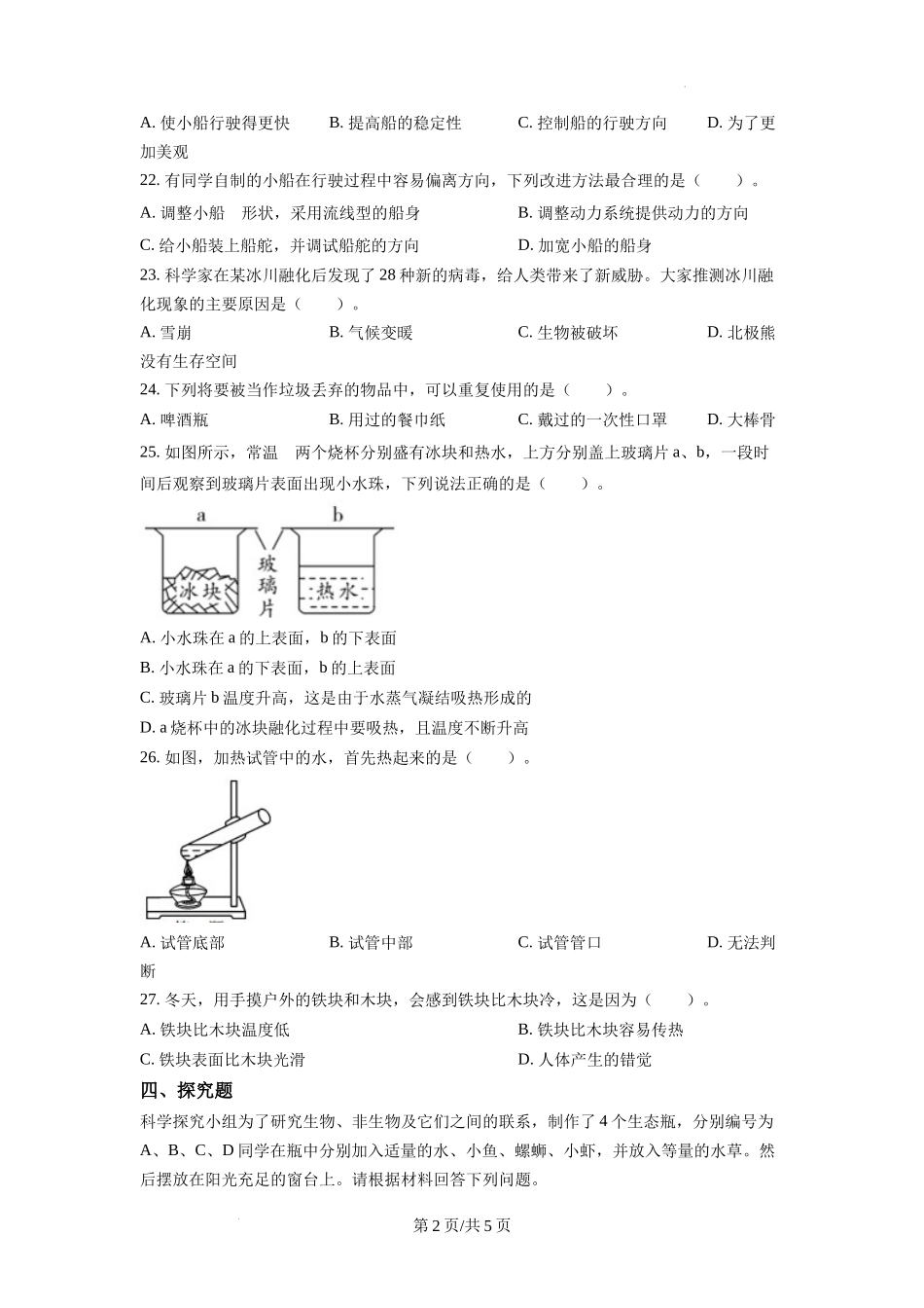宁波市镇海区教科版五年级下册期末考试科学试卷(原卷版).docx_第2页