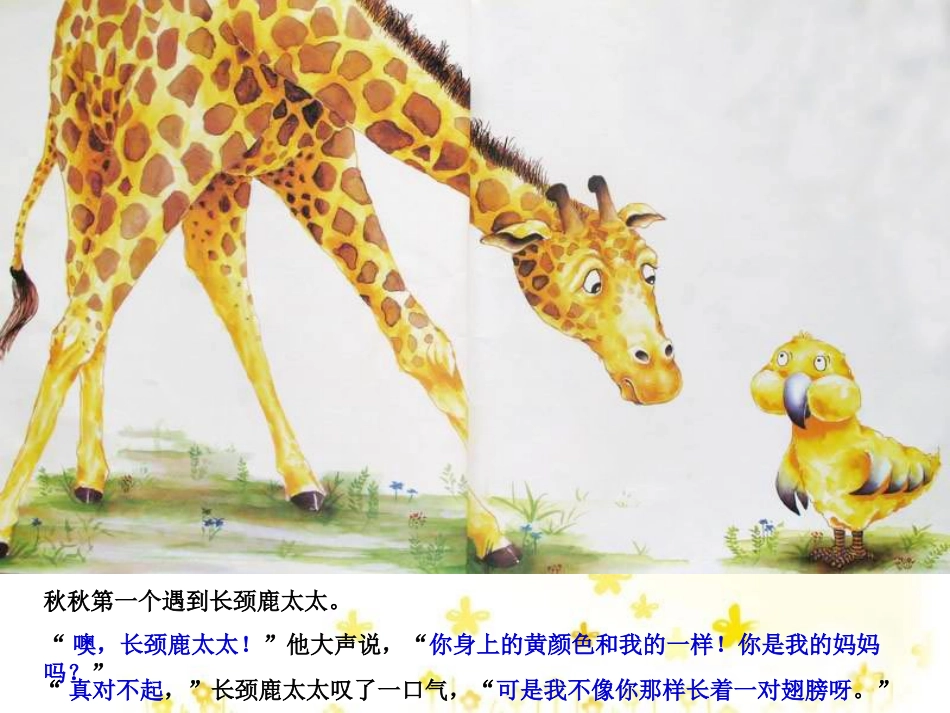 庆子·凯萨兹秋秋是一只小小鸟,过着孤单的生活。他好想有一个妈妈,可是谁能做他的妈妈呢?有一天,他出去找妈妈。秋秋第一个遇到长颈鹿太太。“噢,长颈鹿太太!”他大声说,“你身上的黄颜色和我的一样!你是...