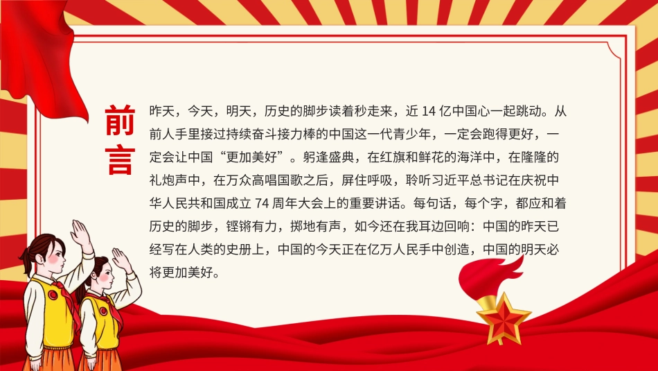 中国的明天必将更加美好更加灿烂china'sfuturewillbemorebeautifulandbrilliantchina'sfuturewillmorebeautifulandbrilliant宣讲人:某某某时间:20XX.XX我与祖国共成长前言昨天,今天,明天,历史的脚步读着秒走...