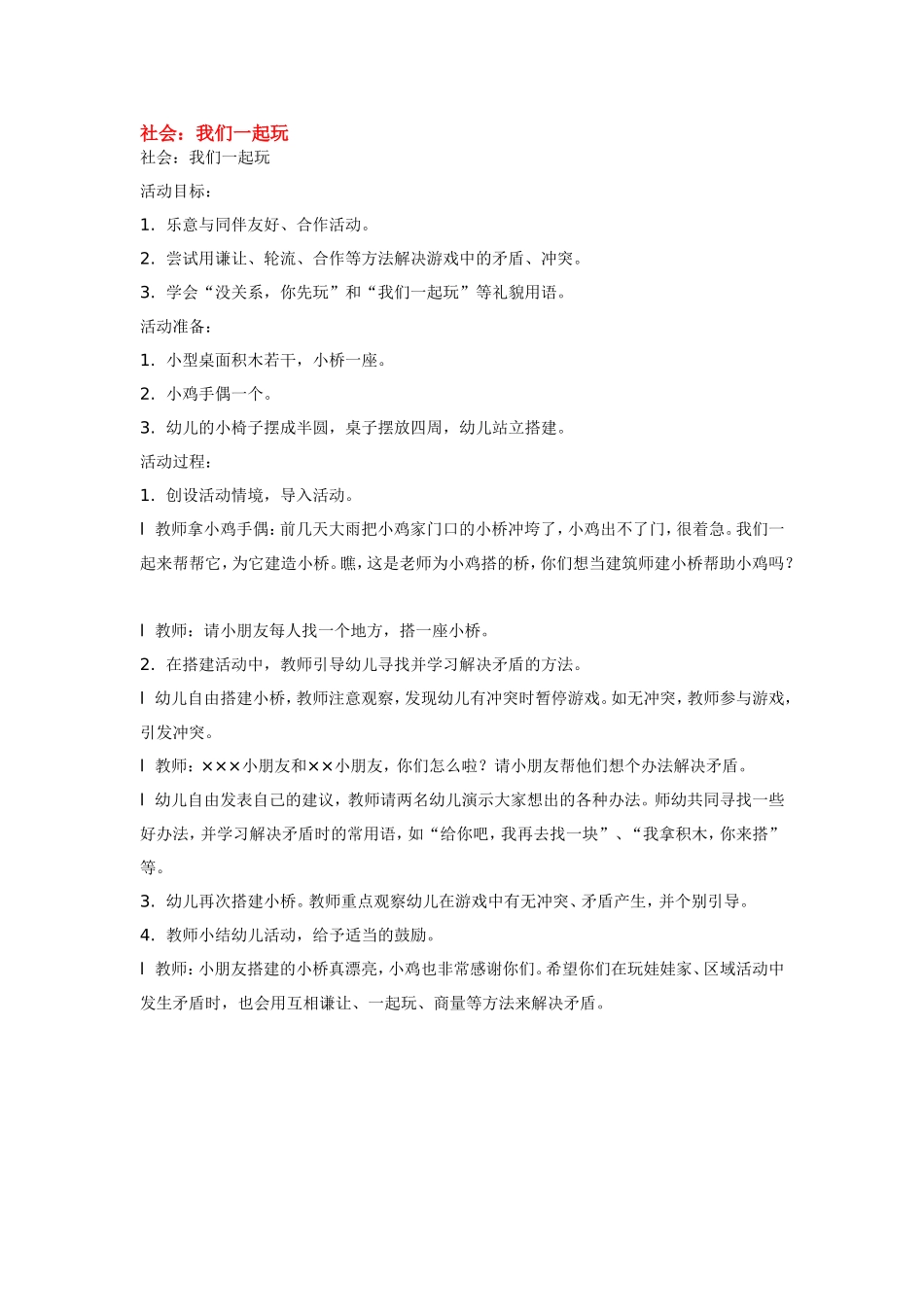 社会:我们一起玩社会:我们一起玩活动目标:1.乐意与同伴友好、合作活动。2.尝试用谦让、轮流、合作等方法解决游戏中的矛盾、冲突。3.学会“没关系,你先玩”和“我们一起玩”等礼貌用语。活动准备:1.小型桌面...