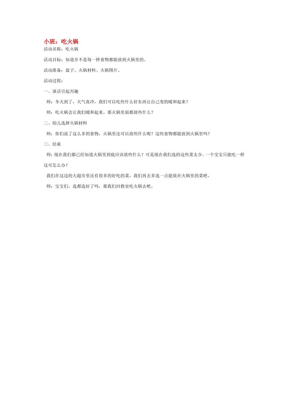 小班:吃火锅活动名称:吃火锅活动目标:知道并不是每一样食物都能放到火锅里的。活动准备:盘子、火锅材料、火锅图片、活动过程:一、谈话引起兴趣师:冬天到了,天气真冷,我们可以吃些什么好东西让自己变的暖...